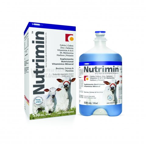 NUTRIMIN es un suplemento nutricional inyectable, compuesto por un núcleo vitamínico-mineral especialmente indicado para optimizar y equilibrar el metabolismo general del animal, en estados carenciales o de subnutrición en relación a las deficiencias solas o combinadas de Calcio, Selenio, Fósforo, Cobre, Zinc, Potasio, Vitamina E, A y Metionina, elementos esenciales en la activación metabólica enzimática.